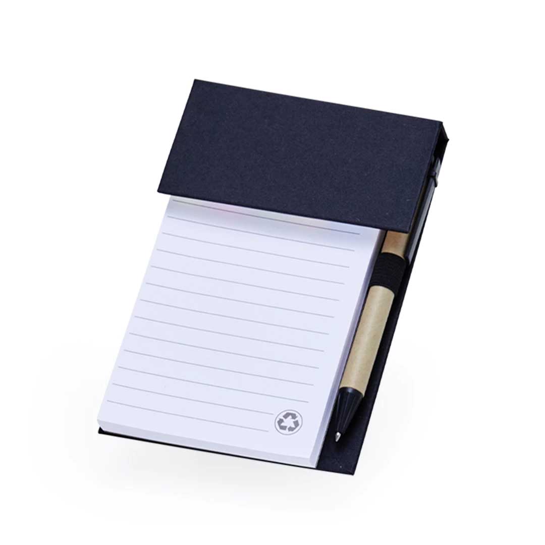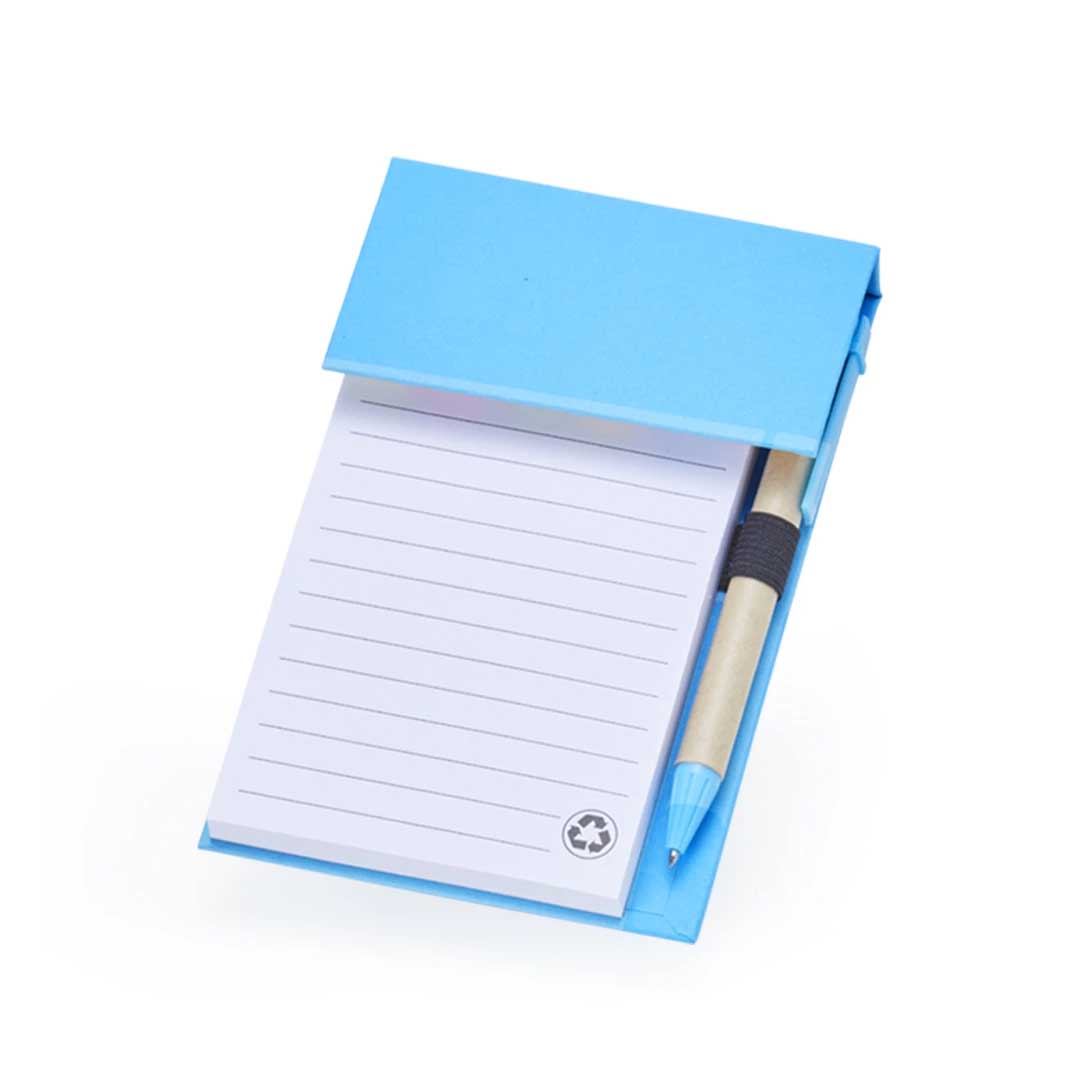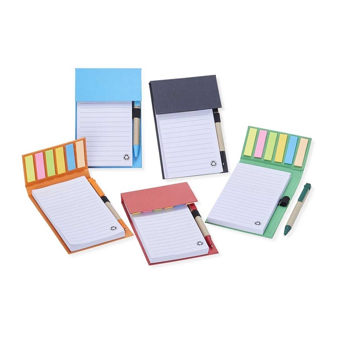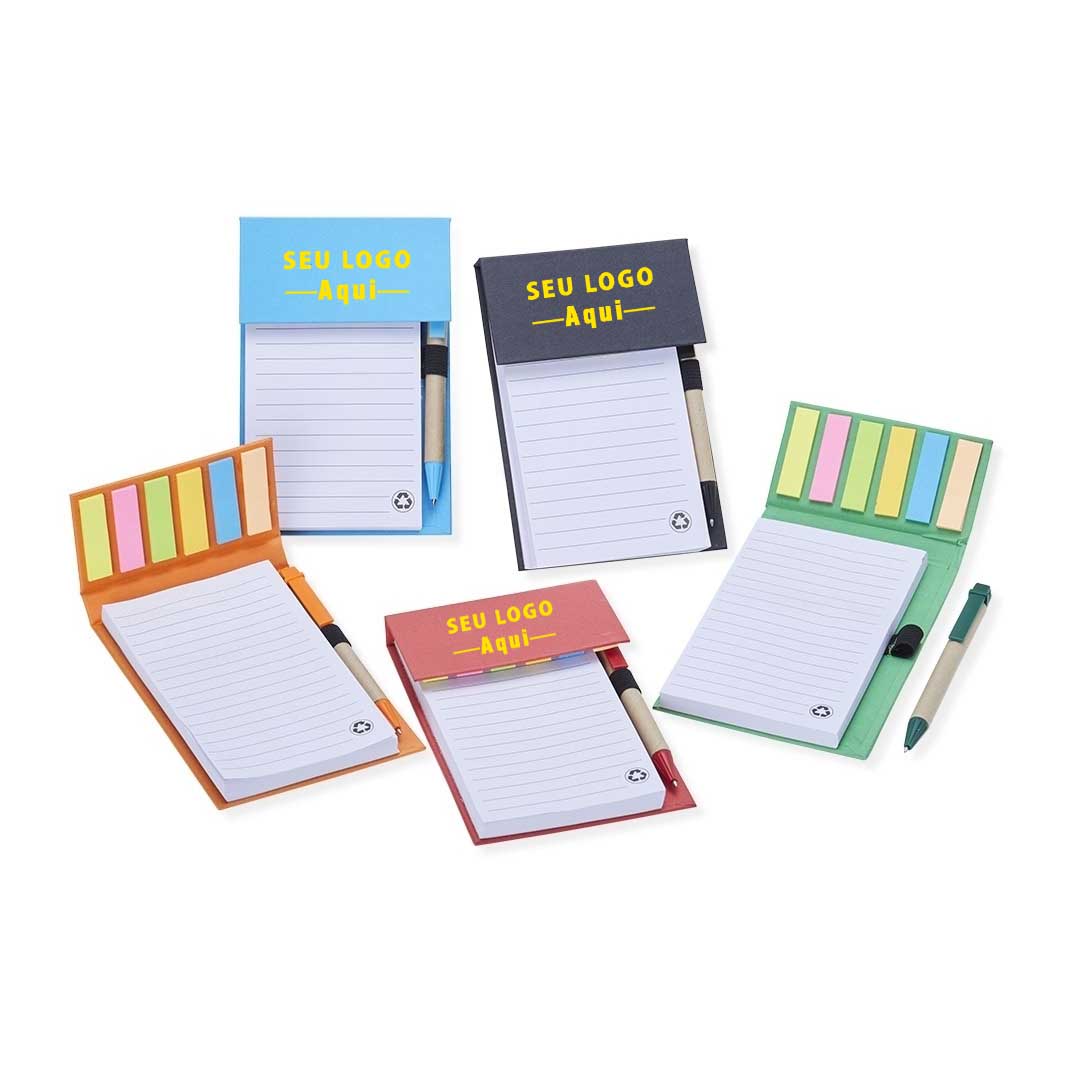 Bloco de anotações ecológico com caneta Personalizado, feito em kraft com 6 blocos autoadesivos coloridos com aproximadamente 20 folhas e bloco com aproximadamente 100 folhas brancas com pauta. Possui porta caneta elástico e acompanha caneta de papelão e detalhes plásticos, carga esferográfica azul 1.0mm e acionamento por clique.
