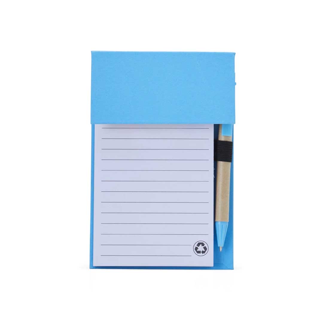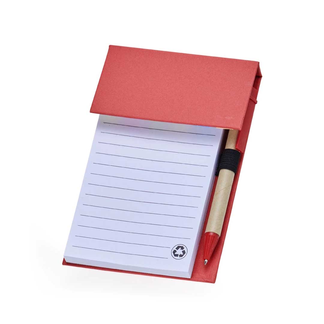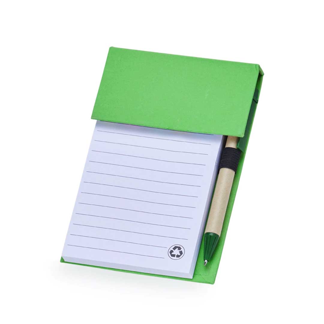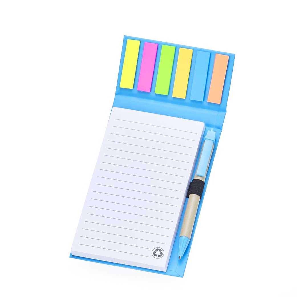 Bloco de anotações ecológico com caneta Personalizado, feito em kraft com 6 blocos autoadesivos coloridos com aproximadamente 20 folhas e bloco com aproximadamente 100 folhas brancas com pauta. Possui porta caneta elástico e acompanha caneta de papelão e detalhes plásticos, carga esferográfica azul 1.0mm e acionamento por clique.