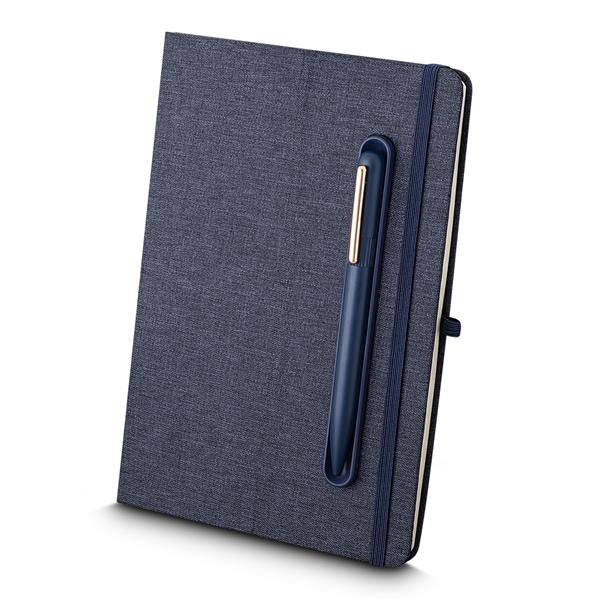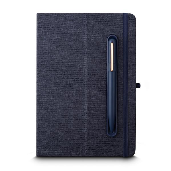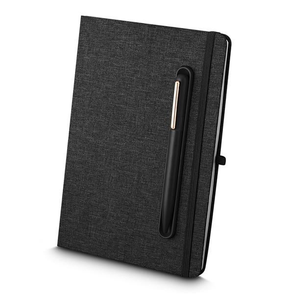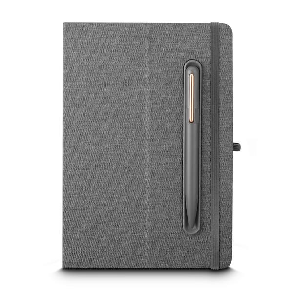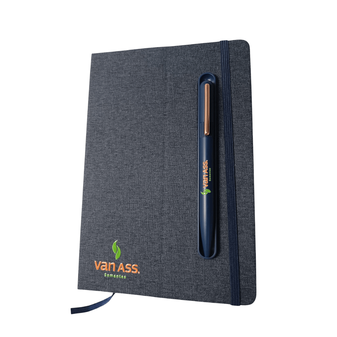 Caderno produzido com capa em tecido RPET e suporte para caneta na capa, capa dobrável para suporte de smartphone, miolo com 80 folhas pautadas.
