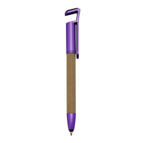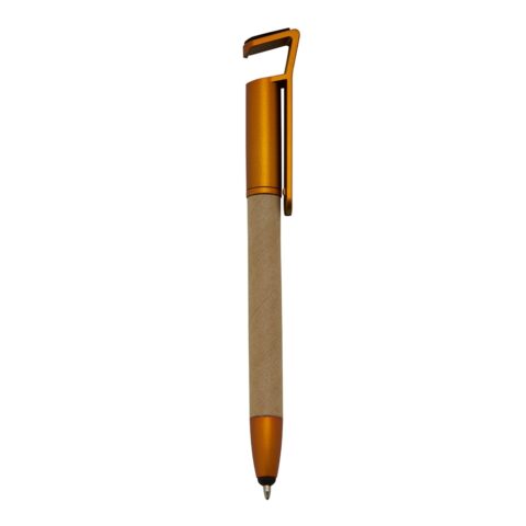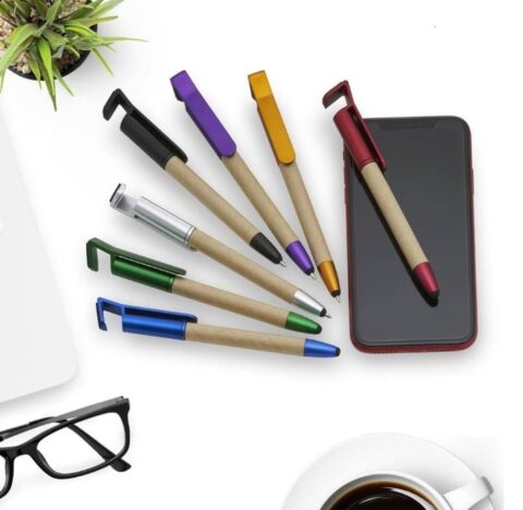 Caneta ecológica touch com suporte para celular, corpo de papelão e detalhes em plástico.