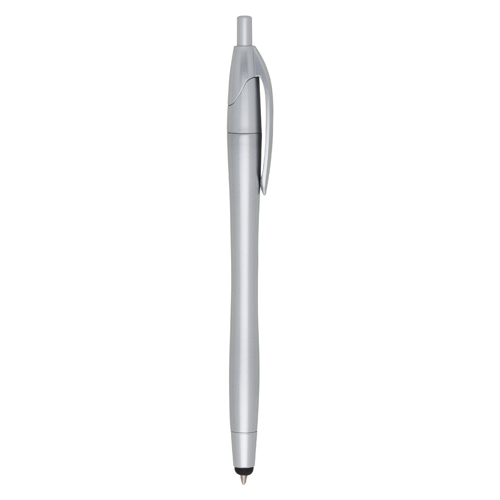 Caneta plástica com ponteira touch screen, carga esferográfica azul e acionamento por clique.