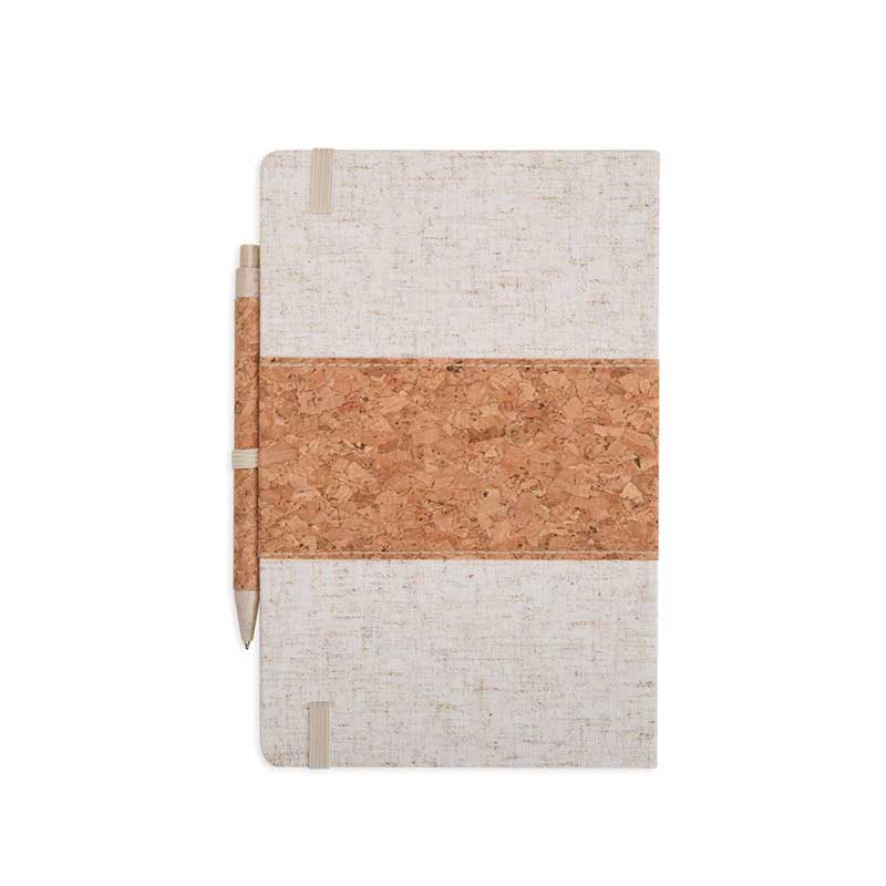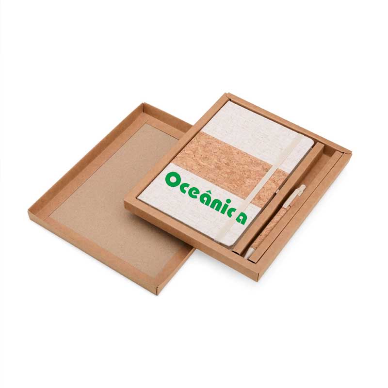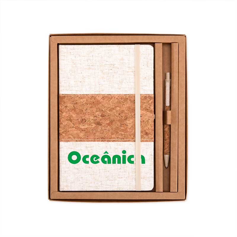 Este kit contém uma Caderneta A5 em linho com detalhe em cortiça e suporte para caneta, marcador de página em cetim, aproximadamente 82 folhas com pauta e caneta de cortiça com detalhes em palha de trigo, carga esferográfica azul 1.0mm e acionamento por clique.